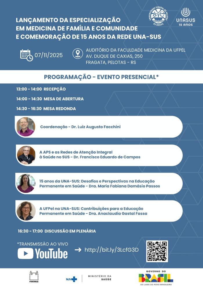Nesta sexta-feira, 7 de novembro, às 13h, no auditório da Faculdade de Medicina, Terapia Ocupacional e Psicologia da Universidade Federal de Pelotas (UFPel), será realizado o lançamento do curso de Especialização em Medicina de Família e Comunidade, oferecido na modalidade a distância pela Rede Universidade Aberta do Sistema Único de Saúde (UNA-SUS).