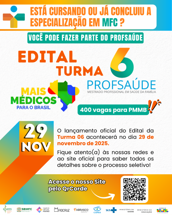 O lançamento oficial do edital da Turma 06 ocorrerá no dia 29 de novembro de 2025. Para informações detalhadas sobre o processo seletivo, acesse: profsaude-abrasco.fiocruz.br