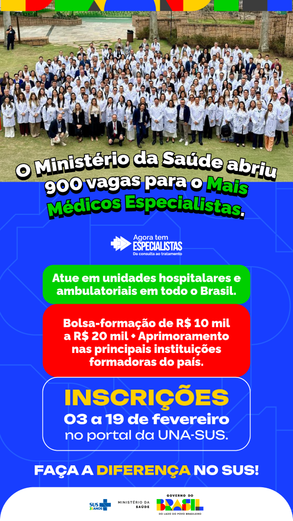 O Mais Médicos Especialistas também possibilita o ingresso imediato de médicos egressos da residência médica no SUS, acelerando a fixação desses profissionais e garantindo atendimento qualificado à população.