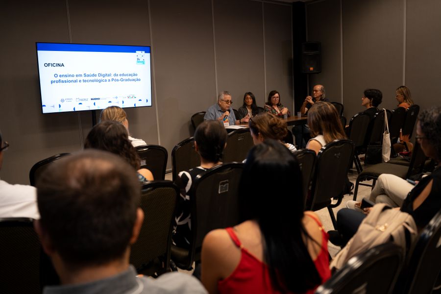 Durante toda a manhã, foram discutidos temas como competências digitais necessárias aos profissionais de saúde, desigualdades territoriais na formação, tendências internacionais e demandas concretas dos serviços de saúde diante da transformação digital.