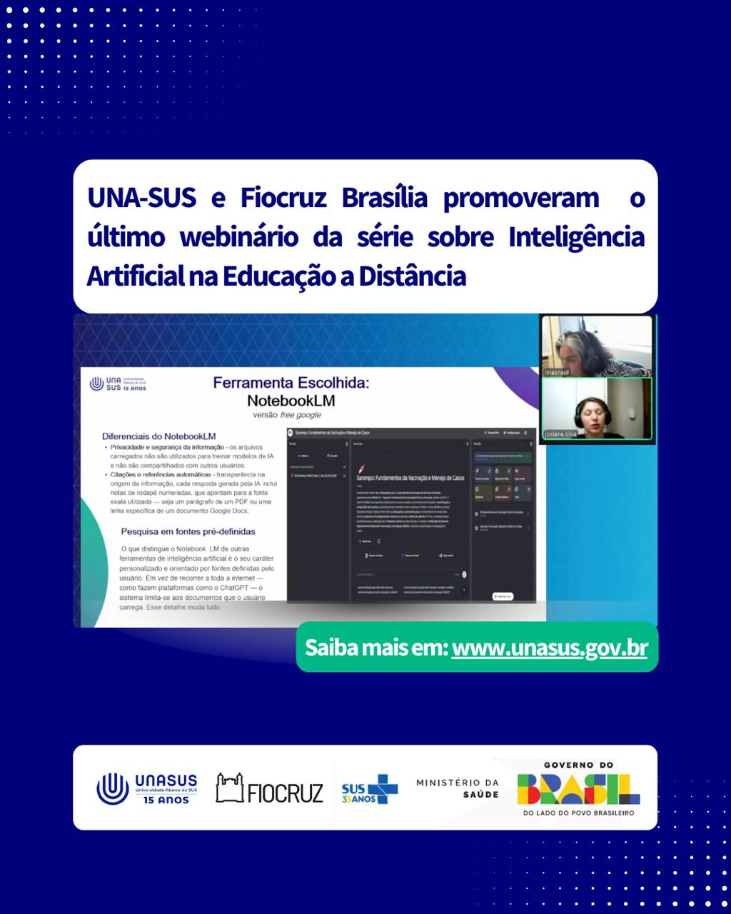 No dia 29 de outubro, quarta-feira, a UNA-SUS, em parceria com a Fiocruz Brasília, realizou o webinário “IA na Construção de Estratégias Educacionais em Cursos Online”.