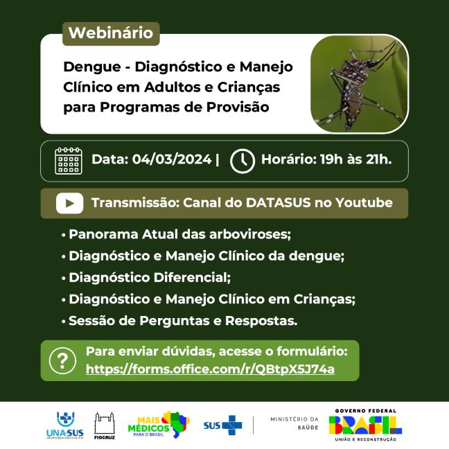 A Secretaria Executiva da UNA-SUS e o Ministério da realizam, no dia 4 de março, o webinário "Dengue: Diagnóstico e Manejo Clínico - Adultos e Crianças para Programas de Provisão", com transmissão ao vivo pelo Canal do DATASUS, no YouTube, das 19h às 21h.
