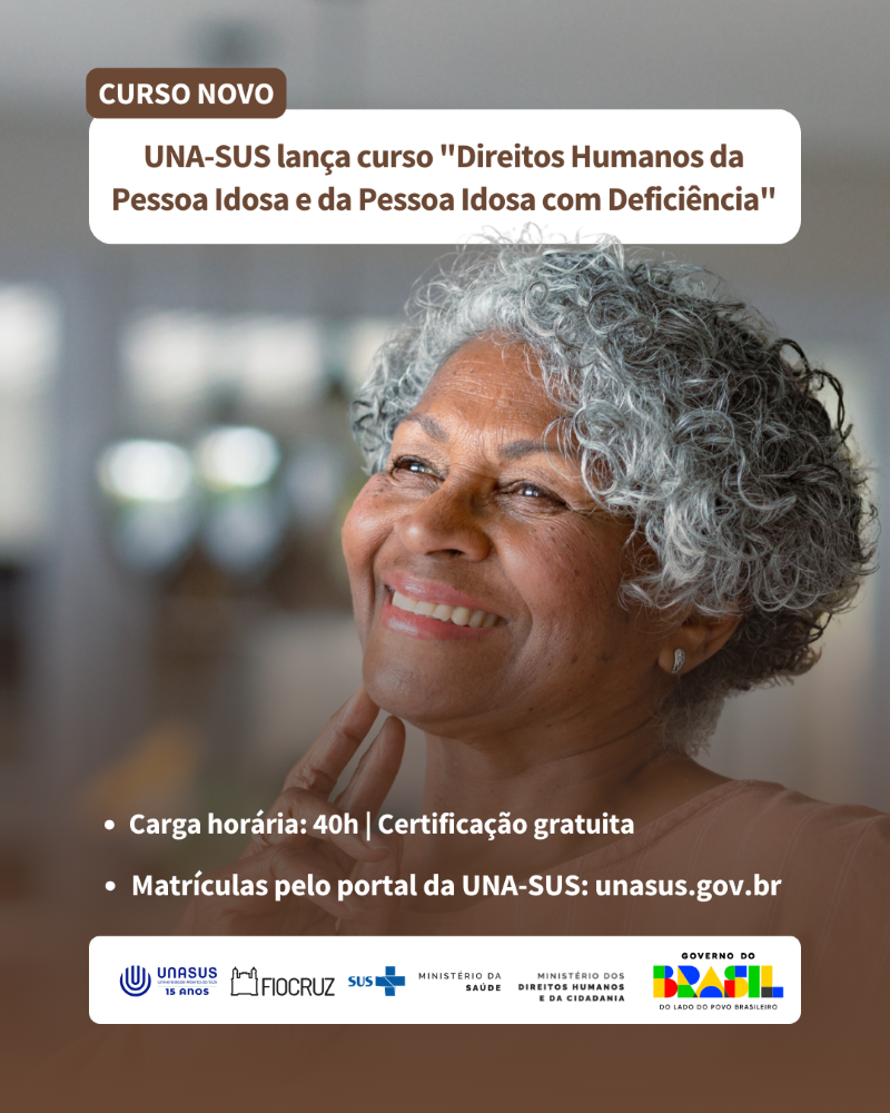 Estão abertas as matrículas para o curso Direitos Humanos da Pessoa Idosa e da Pessoa Idosa com Deficiência, fruto da parceria da UNA-SUS com a Secretaria Nacional dos Direitos da Pessoa Idosa (SNDPI), do Ministério dos Direitos Humanos e da Cidadania (MDHC), a Fiocruz e o Ministério da Saúde.