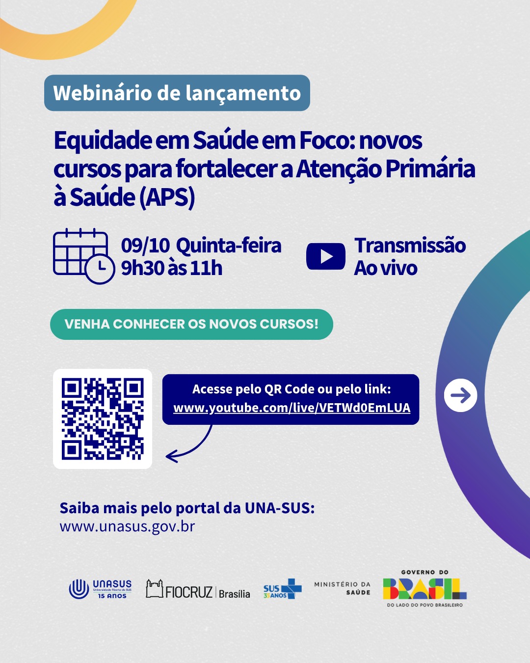 No dia 9 de outubro (quinta-feira), das 9h30 às 11h, a UNA-SUS, em parceria com a Fiocruz Brasília e o Ministério da Saúde, realiza o webinário “Equidade em Saúde em Foco: novos cursos para fortalecer a Atenção Primária à Saúde (APS)”.