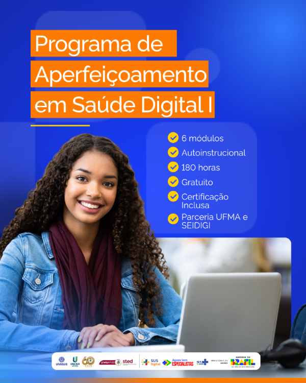 A Universidade Federal do Maranhão (UFMA), por meio da UNA-SUS e em parceria com a Secretaria de Informação e Saúde Digital (SEIDIGI), está com inscrições abertas para o Programa de Aperfeiçoamento em Saúde Digital I.