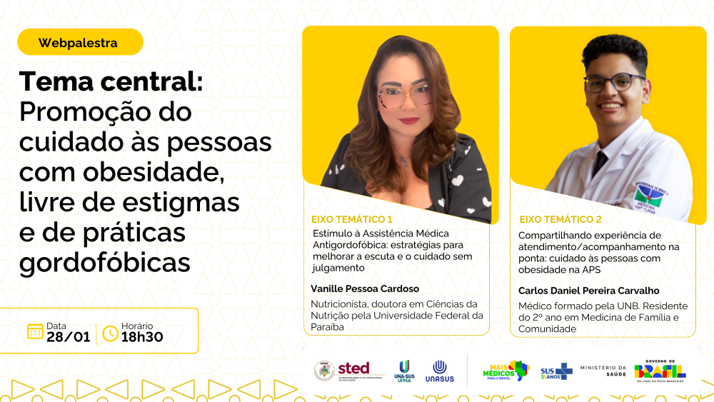 A Universidade Aberta do Sistema Único de Saúde da Universidade Federal do Maranhão (UNA-SUS/UFMA) realizará, no dia 28 de janeiro, às 18h30, uma webpalestra abordando o tema “Promoção do cuidado às pessoas com obesidade, livre de estigmas e de práticas gordofóbicas”. O evento será transmitido ao vivo pelo Canal da UNA-SUS/UFMA, no YouTube.